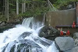 A small weir type dam was built at the lake outlet, and, by limiting the discharge into the creek, aids in maintaining the lake level. The weir has a large pipe and valve in its base to pass the minimum 2 cubic feet per second (0.057 m3/s) required to maintain the creek. This is in addition to the water which will be spilled to create power.