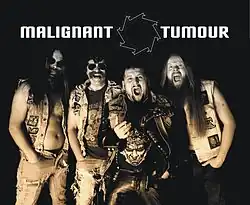 Malignant Tumour was formed in Ostrava at the end of 1991 by Martin "Bilos" Bílek and Roman Restel, at the ages of 15 and 14, respectively.[2] When drummer Libor Šmakal joined in 1992, their style became influenced by the work of British grindcore band Carcass.[3] In this lineup, they recorded their early demo tapes Cadaveric Incubator of Endo-Parasites (1993), Symphonies for Pathologist (1994), and Analyse of Pathological Conceptions (1995). In late 1995, Šmakal was replaced by Michal "Cichoň" Cichý, leading to Restel departing as well and being replaced by Otto Beran. The same year, Malignant Tumour released a split EP with Decomposed, titled Malignus Morbus. This was followed a year later by three more split EPs: Forensic Clinicism – The Sanguine Article with Immured, Sick Sinus Syndrome with Mastic Scum, and Swarming of Virulency with Ingrowing.