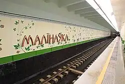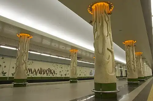 Malinawka (also referred to as Malinaŭka or Malinovka) (Belarusian: Малінаўка, romanized: Malinaŭka; Russian: Малиновка, romanized: Malinovka) is a Minsk Metro station. It was opened on 3 June 2014. Architectural elements of the station were enhanced by the work of sculptor Maxim Piatrul.