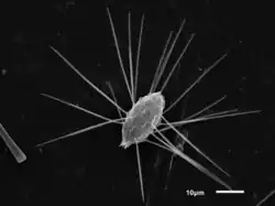 Mallomonas is a genus comprising unicellular algal eukaryotes and characterized by their intricate cell coverings made of silica scales and bristles.[1] The group was first named and classified by Dr. Maximilian Perty in 1852.[2] These organisms live in freshwater and are widely distributed around the world.[3] Some well known species include Mallomonas caudata and Mallomonas splendens.