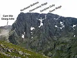 On 6 April 1906, Mallory, Irving, and Leach reached the summit of Ben Nevis,[n 7] climbing in snow via Observatory Gully and Tower Gully on the northeast face.[138] The following day, the trio ascended Stob Bàn, following the corniced main arête to the summit.[139] On 9 April, they climbed to the summit of Càrn Mòr Dearg, which preceded a second successful ascent of Ben Nevis on the same day via North Trident Buttress.[140] On 10 April, they successfully climbed a feature on Ben Nevis—that they termed East Zmutt Ridge after Zmutt Ridge on the Matterhorn—likely graded YDS 5.5–5.6.[141] On 12 April, Mallory, Irving, and Leach attained a successful ascent of Ben Nevis in snow and ice via North-East Buttress.[142] Their achievement was the second recorded winter ascent of this route, after the first in 1896.[141][143]