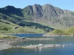 In September 1911, Mallory and his sister Mary were joined by Harold Porter, Mallory's climbing partner, and stayed at the Snowdon Ranger Inn on the shore of Llyn Cwellyn.[166][167] Mallory and Porter pioneered new routes that elevated Mallory to the pinnacle of British climbing.[168] On Y Garn, with Porter leading Mallory on the crux, they ascended a new route, now known as Mallory's Ridge, at 394 ft (120 m), graded 5.9–5.10a.[168][169] This route defeated James Thomson in 1910, who abandoned it on the most challenging pitch, a sixty-foot segment of vertical rock.[168]