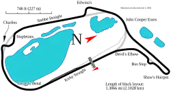 The circuit has a number of formations, founded on a basic one-mile oval, with the majority of configurations including the northerly extension to the tight, 180° Shaw's Corner. When used without the hairpin-loop, to achieve the shorter-length lap (one mile) configuration, the link section was known as Castrol Chicane.[2]