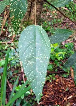 Leaves feature long stems, variable in length but usually between 4 and 10 cm. Leaves alternate on the stem, without leaf teeth, lanceolate or ovate in shape with a long tip. The leaves are fairly thin, 4 to 10 cm long. The underside is greyish, the upper surface green, almost hairless. Hence the species name discolor, meaning two colours.