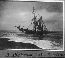 The Malpas Belle was a wooden schooner, a brigantine (179 tons) built in 1872 by Nicholas Scoble Truro. The boat became stranded on Seaton beach on 3 February 1922 during a voyage from Antwerp to Penarth with a cargo of bog ore on board.