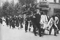 - 14 August: Obersturmführer Lagana (or Lagna, Legana), the commander of a company from the Dirlewanger brigade, gave the order for everyone to immediately leave the hospital. Colonel Strehl organized the transfer of about 200 wounded, unable to move on their own, through the German-controlled Saxon Garden towards the Ujazdów Hospital, and then to the PKO building on Jasna Street (which was given the codename "Moses" at that time).[26] Dr. Dreyza took care of a group of 30 wounded who were left behind because there were no stretcher-bearers available during the first transport; he arranged their transfer to the Wola Hospital.[10][27] The evacuation of the Malta Hospital without casualties, along with its full equipment for 120 patients, is considered an unprecedented event in the history of the Warsaw Uprising.[1][2]