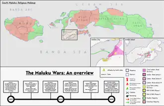The principal causes of the conflict are attributed to general political and economic instability in Indonesia following the fall of Suharto and the devaluation of the rupiah during and after a wider economic crisis in Southeast Asia.[2] The forthcoming division of the existing province of Maluku into the new provinces of Maluku and North Maluku exacerbated existing district political disputes further[3][4] and, as the political dispute had been characterized along religious lines, inter-communal fighting broke out between Christian and Muslim communities in January 1999, cascading into what could be described as all-out warfare and atrocities against the civilian population committed by both sides.[5] The main belligerents were therefore religious militia from both faiths,[6] including the well-organised Islamist Laskar Jihad,[7] and Indonesian government military forces.[8]