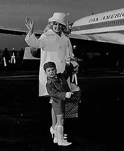 On July 1, 1966, she married Lee Meyers, a pitcher for the California Angels, in Boise, Idaho. When they married, she was 33 and he was 19.[80] In her memoir, she recalled she had only married him because she had become pregnant by football player Joe Namath and wanted to avoid a scandal.[81] She convinced him to marry her after she lied the baby was his.[82] Eventually, however, the marriage began to crumble; filled with regret and seeing no other option, she aborted the baby.[83] She divorced him in Santa Anna only a year after they married due to his wild personality and drug use; he died shortly after in a car crash.[84][85][86]