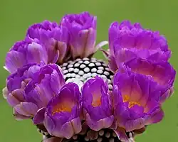 Flowers are up to 3 cm long and wide (twice as wide as the stems),[3] with a striking color combination, featuring magenta petals, a white throat, yellow to orange anthers, and a greenish stigma. It is highly floriferous, blooming through most of the summer and often with so many flowers that the plant body is almost entirely obscured.[5] Pure white flowers have been reported in cultivation, but are extremely rare and have never been observed in the wild.[11] The fruits are round (4.5 mm in diameter), yellow-green to reddish-green, and mostly hidden in the stem. When they dry, they leave a hollow filled with up to 15 seeds. The seeds are black, round, about 1 mm long, with a finely textured surface and a slightly oval shape.[2][12]