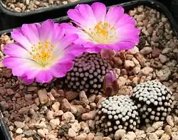Mammillaria luethyi is a species of cactus endemic to the Mexican state of Coahuila. The plants are miniature, shaped like balls and covered with tiny white spines and, throughout the summer, large magenta flowers.