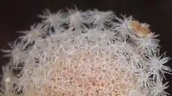 The bumps on the plant's body, called tubercles, are slender, cylindrical, up to 5.5 mm long and 1.3 mm wide, dark green with reddish or whitish bases that dry and fall off underground. Each tubercle is densely covered with up to 80 tiny white spines, arranged in flat clusters 1.3–1.8 mm wide that completely cover the top of the plant (apex). The spines are 0.4–0.6 mm long, with the uppermost slightly longer and translucent. Some spines radiate outward, forming a small umbrella-like shape at the tip.[2] Under intense magnification, the areole resembles a cluster of tiny stars.[3] This branching of the spines makes M. luethyi one of the most recognizable Mammillaria species[10] and unique among all known cacti.[3]