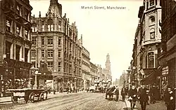 Neither Stewart's The Stones of Manchester (1956) nor Sharp et al.'s survey Manchester Buildings (1966) describe the area or any buildings in particular. Stewart is generally strong on Victorian architecture, and none of its 60 "principal buildings" were within the redevelopment area. Sharp et al. covered older and new buildings; of the many described over fifty are in the city centre but none were in the cleared area.[32][33] Pevsner, writing in 1969 when clearance was imminent, found nothing of note.[34] H. W. D. Sculthorpe, the town clerk, described the buildings as obsolescent in evidence to the public enquiry.[29] Shop Property predicted in 1971 that as "new buildings replace the existing dilapidated ones" the city centre would lose its Coronation Street image, and become "very attractive" to retailers.[35] The Guardian, which had offices in Cross Street, wrote in 1976 that Market Street had been "depressing and decaying" for 30 years.[36]