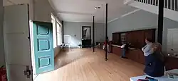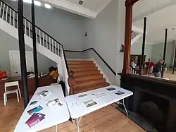 The passengers proceeded upstairs to the waiting room, and licensed "outdoor porters" took charge of their luggage, being paid a set scale of fees. "Indoor porters" took charge of the luggage on the station platform and strapped it to the carriage roofs. The ringing of the station bell then announced that the passengers could go through the door on to the platform and board the train. The bell was also rung as a warning of departure, but the actual signal was given by the guard's trumpet or horn. The original bell is still exhibited in the station building. The planning of railway stations was clearly not so advanced at this time as supporting pillars of the building prevented certain carriage doors from opening fully.