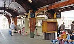 In 1876, about £12,000 was spent on enlarging the station facilities, including the provision of a refreshment room; the station was then said to be handling about a hundred thousand passengers a week.[28] Train-handling congestion was eased when Manchester Central station came into use, and in 1892 the MSJAR, under pressure to greatly improve Knott Mill, rejected the suggestion of Manchester Corporation that it could kill two birds with one stone by replacing its two existing unsatisfactory stations with a single new, thoroughly satisfactory, station somewhere between them.[29] The MSJAR offered instead a limited reconstruction of the waiting rooms and booking hall; it also rejected the council's offer of assistance with providing a more suitable approach to the station[30] only to accept it two years later.[31]