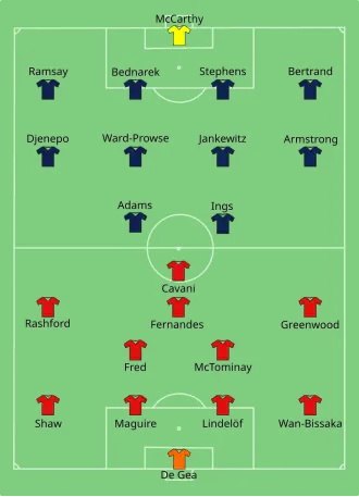 While Manchester United had a full squad available heading into the match, Southampton were missing several players through injury, including Ibrahima Diallo, Michael Obafemi, Oriol Romeu, Mohammed Salisu, Will Smallbone, Nathan Tella, Jannik Vestergaard, Theo Walcott and Kyle Walker-Peters.[11] Southampton made four changes from their 1–0 loss to Aston Villa three days earlier; in the absence of central midfielders Diallo, Romeu and Smallbone, manager Ralph Hasenhüttl gave a full debut to Swiss 19-year-old Alexandre Jankewitz, who had come on as a late substitute against Aston Villa. Right-back Walker-Peters had not played since Southampton's 1–0 FA Cup fourth round win over Arsenal and was deputised by Kayne Ramsay, as Yan Valery had been loaned to Birmingham City before the transfer deadline the previous day. Their other changes saw Moussa Djenepo and Ché Adams come in for Walcott and Nathan Redmond, who was on the bench.[12] Southampton had seven youth-team players, including youngster Will Ferry on the bench.[13] Manchester United's only change to their starting line-up saw Mason Greenwood come in for Paul Pogba, while Brandon Williams, who had been a candidate to go out on loan during the transfer window, replaced Axel Tuanzebe on the bench.[14][15]