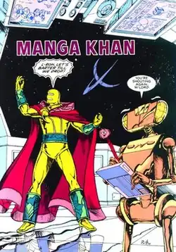 Manga Khan, originally known as Lord Manga, is a DC Comics supervillain and an intergalactic trader. A gaseous being, he relies on a metallic suit to give him form. He had a robot companion named L-Ron (before trading him to the Justice League), and was a foe of the Justice League International in the early 1990s.[1]