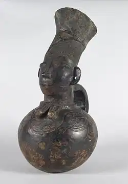 The Mangbetu is African tribe part of Democratic Republic of the Congo, living in the Orientale Province. The people of this tribe produced a large variety of highly developed art and music, such as harps, guitars, pots, and other crafts.[1] Their pots are still prominent in today's art spectrum, and ones that have been constructed in the early days of the tribe are sold to collectors and people alike for high prices.[2]