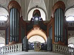 The organ was built by the company Steinmeyer (Oettingen) in 1956 and is a musical keyboard instrument with 34 organ stops (3 transmissions in the pedal) and an electro-pneumatic tracker (Taschenladen). At the balustrade is the Rückpositiv located that carries ornaments with the seal of Charles Philip III .