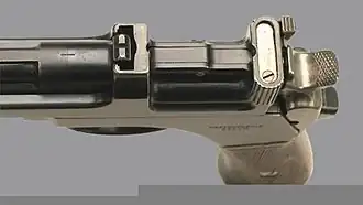 Because of this cam hold-open, the pistol does not close when the clip is removed. However, drawing back slightly on the breechblock will ride it over the cam, and releasing it will permit the recoil spring to close the action.