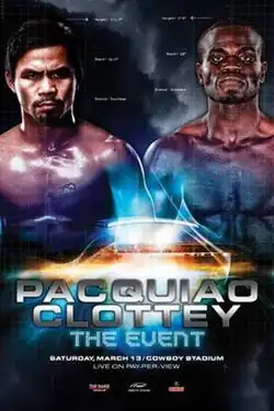 Manny Pacquiao vs. Joshua Clottey, billed as The Event, was a professional boxing match contested on March 13, 2010, for the WBO welterweight championship.[1] The bout was held at Cowboys Stadium, in Arlington, Texas, U.S. This match was put together after the long awaited superfight between Manny Pacquiao and Floyd Mayweather Jr. had fallen through.