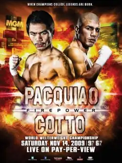 Manny Pacquiao vs. Miguel Cotto, billed as Firepower, was a boxing match for the WBO welterweight championship.[1] The bout was held on November 14, 2009, at the MGM Grand Garden Arena, in Las Vegas, Nevada, United States. Pacquiao won the fight via technical knockout in the twelfth round.