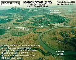 Manokotak Airport (IATA: KMO, ICAO: PAMB, FAA LID: MBA, formerly 17Z) is a state-owned public-use airport located one mile (2 km) north of the central business district of Manokotak, a city in the Dillingham Census Area of the U.S. state of Alaska.[1]