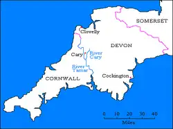 In the 14th century, Clovely is found held by the Cary family.[18] Sir John Cary purchased the manor but probably never lived there and certainly died in exile in Ireland.[19] At some time after 1350[20] the Cary family acquired the manor of Cockington, in Devon, which they made their principal seat. Certainly according to Pole, Robert Cary held Cockington during the reign of King Henry IV.[21] It then passed to Sir Philip Cary, of Cockington, eldest son and heir, by his father's first wife.[22]
