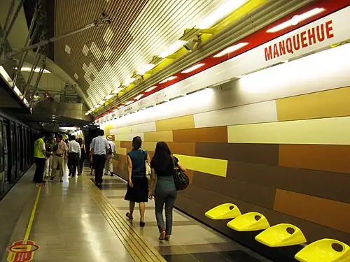 Manquehue is an underground metro station on the Line 1 of the Santiago Metro, in Santiago, Chile. It is part of the 3.8 kilometres (2.4 mi) eastern extension of the Line 1.[2] The station was opened on 7 January 2010 as part of the extension of the line from Escuela Militar to Los Dominicos,[3]