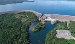 The dam impounds the Manso River in the upper Paraguay sub-basin of the Paraná basin. The reservoir is in the municipalities of Chapada dos Guimarães and Rosário Oeste in the midwest region of Mato Grosso.[2] It is the largest in the Paraopeba system.[3] The dam is 86 kilometres (53 mi) from Cuiabá, the state capital, along good roads. It is about 360 metres (1,180 ft) above sea level. The lake has become a tourist attraction.[4]