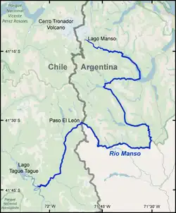 The Manso River arises at elevation of 1,000 metres (3,300 ft) in the small lake fed by the Ventisquero Negro glacier. The river flows about 10 kilometres (6.2 mi) eastward to Mascardi Lake. From Lake Mascardi the river passes through or by a chain of lakes separated by short passages of often turbulent river. The lakes include Las Moscas, Hess, Roca, Franck, Martin, and Steffen. A road (unpaved in 2015) runs along the eastern and south shore of Mascardi Lake and continues downstream for another 10 kilometres (6.2 mi), ending near Lago Hess. The river then runs through a roadless area until reaching the lower end of Lake Steffen, where a road rejoins the river. Lake Steffen is the last lake in the chain and the Manso continues its path through Argentina and into Chile. About 35 kilometres (22 mi) after entering Chile the Manso joins the Puelo River.[1]