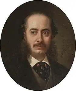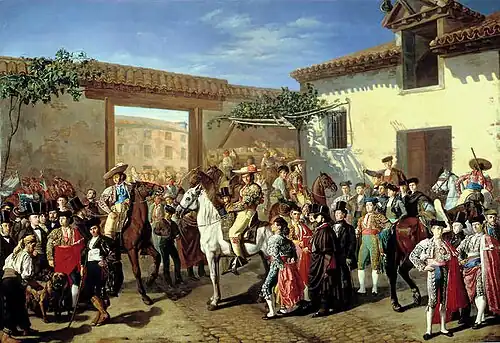 In 1856, he won honorable mention at the first National Exhibition of Fine Arts for his painting of the picadors preparing their horses at the old bullring in Madrid (demolished in 1874), which incorporates portraits of many of the period's most popular bullfighters, including Paquiro.[2]