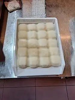 The tofu is inoculated with Mucor micheli and fermented until fungal mycelium grows on the surface of the tofu creating a hairy appearance, which gives the tofu its name.[2][3] Mao Tofu also contains a large diversity of fungal and bacterial communities.[1]