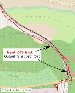 Map matching is implemented in a variety of programs,[12][13] including the open-source GraphHopper and Open Source Routing Machine routing engines.[14] It is also included in a variety of proprietary programs and mapping/routing applications.