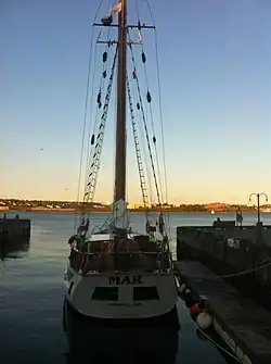 Mar is a sailing tour boat based out of Halifax, Nova Scotia and known for its literary and film associations. Mar was built starting in 1957 and launched in 1959 at Frederikssund Boatbulding in Frederikssund, Denmark.[1] She was built for author Ernest K. Gann, author of several works including "Song of the Sirens", "Twilight of the Gods" and "The High and the Mighty".[2] She was then bought by Charles Tobias owner of Pusser's Rum Company and he used her in the filming of the 1976 film The Way of the Wind.[3] The Mar was then purchased by Mar II Sailing Tours Ltd. based out of Halifax, Nova Scotia in 1982 and she has been sailing there ever since, with the exception of some seven-day sailing excursions around the Caribbean in the 1980s.[4] The Mar has not only sailed to the Caribbean, she has sailed extensively around the tropics and also to the Arctic. She has a sturdy design which has also allowed her to complete two circumnavigations of the globe when owned by Charles Tobias.[5]