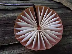 The cap is initially cushion shaped or bell shaped before becoming convex, and it has a small umbo; it reaches a diameter of 2–4.5 cm (0.8–1.8 in). The cap surface is dry, somewhat velvety in texture, and has radial furrows extending to the edge of the cap as well as a pleated margin. The color ranges from tawny brown to rusty brown.[3] The thin yellowish-white gills are up to 6 mm (0.24 in) broad, free from attachment to the stipe, and distantly spaced—there are typically 23–28 gills present. The stipe measures 5.4–8 cm (2.1–3.1 in) long by 1–1.25 mm thick, and is straight or curved, shiny, and hollow. It is dark brown except for a pink region near the top, and it has a tuft of cotton-like white mycelium at the base. The odor and taste of the mushroom are weakly farinaceous (similar to freshly-ground flour).[1] The edibility of the fruit bodies has not been determined.[3]