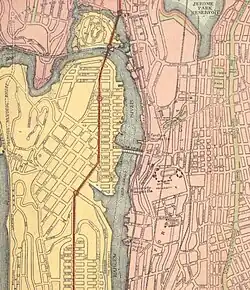 Marble Hill once unmistakably belonged to Manhattan, forming the island's northernmost tip.[4][5][6] The Spuyten Duyvil Creek flowed to the neighborhood's north, connecting the Hudson and Harlem Rivers. The creek separated Marble Hill from the Bronx, and by extension, the North American mainland. Marble Hill became an island in its own right in 1817, when two small streams were dug up to form a 30-foot-wide canal. This waterway ran 1500 feet east–west from the Spuyten Duyvil Creek to the Harlem River at approximately 222nd Street, cutting off Marble Hill from Manhattan Island. Known at different times as Dyckman's Canal, Boltons’ Canal, or Nichols’ Canal, the waterway once powered Curtis and John Bolton's marble mill, which sat alongside it.[4][5][6][7][8][9]