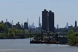 An overview of Marble Hill seen from the west with John F. Kennedy High School (foreground) and the rest of Marble Hill (center) bound by the Harlem River (on right, the site of the Harlem Ship Canal), and The Bronx (background)