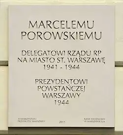 - ^ "Odsłonięto tablicę ku czci prezydenta Marcelego Porowskiego". um.warszawa.pl (in Polish). Archived from the original on 2011-11-19.