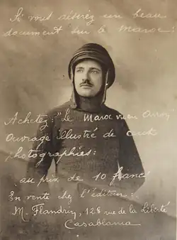Marcelin Flandrin settled in Morocco in 1901, where he completed his military service as a volunteer in 1912. A photographer by profession, he served in the Service Photographique des Armées (fr), completing a series of reports during the Rif War. In World War I, he served in the French Air Force, finishing as an aerial observer sending aerial shots of battles.