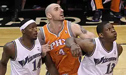 On December 18, 2010, Gortat was traded to the Phoenix Suns along with Vince Carter, Mickaël Piétrus, a 2011 first-round draft pick (which would become Nikola Mirotić), and $3 million, in exchange for Jason Richardson, Earl Clark, and then-former Magic player and former teammate Hedo Türkoğlu.[18] Due to Steve Nash wearing the #13 jersey, which was the number that Gortat had worn in Orlando and Poland, he decided to wear #4 for his tenure with the Suns. During his first season with the Suns, his numbers increased as his minutes grew, initially coming off the bench, then starting at center in place of Robin Lopez. During his time in Phoenix, Gortat continued to be known as "The Polish Hammer" a nickname originally given to him during his time with the Orlando Magic.