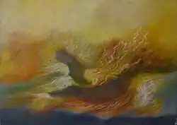 The new conception of Filoplastica entails a different organization of the pictorial space. The previous significance of Tonaltimbrica, sharp and penetrating, took on the appearance of a filament, thin and sinuous, which immerses itself in the basic chromatic layer of the painting.[21] Filoplastica represents a stylistic inversion of the Tonaltimbrica components: the timbral mark of pure colour becomes a chromatic line characterised by changes in tone that, consequently, also involve the background, which, in its initial application, unlike Tonaltimbrica, stands out for its uniformity. The interpenetration between the filament and the colour base of the painting bestows upon the representation the characteristics of a plastic, impalpable, and luminous form, conceived by Almaviva as the expression of that primordial matter that he aims to investigate, despite its inherent incomprehensibility.[22]
