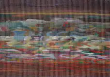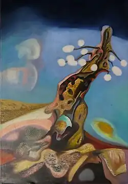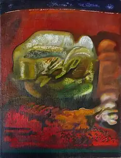 The Tonaltimbrica was presented as "a two-dimensional painting in a single figurative system."[15] Stylistically, it is characterized by the extreme reduction of its two constituent elements: on one hand, the "tonal" element that outlines the masses in the background of the painting using a color base that defines spaces through variations in tone within a uniform chromatic range; on the other hand, the "timbric" sign, consisting of the relief texture of pure color that structures the tonal masses in the background of the picture.[16][17] It is through the interaction of these two distinct components (tonal+timbric) that a representation is achieved that is "rough and poignant," "able to make one feel the struggle and drama that continuously unfold at every level of life."[13]