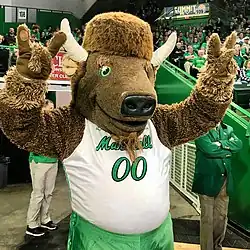 Marco the Bison is the official costumed mascot of Marshall University in Huntington, West Virginia. He is an American Bison dressed in the home uniform of the school. Marco's name developed from a mix of the university's name at the time, Marshall College. Marshall became a University in 1961, but the name for Marco stuck.[1]