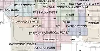 In 2002, the City of Philadelphia legislated boundaries of the Sports Complex Special Service District. The residential communities defined included Marconi Plaza. The Special District established an overlay providing the basis for a new definition to Marconi East as community 3 and Marconi West as community 4.