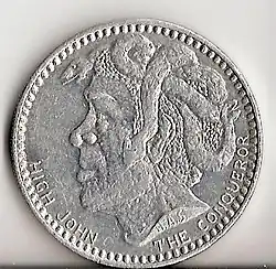 Mardi Gras doubloons were first created by New Orleans artist and entrepreneur H. Alvin Sharpe in 1959.[2] Sharpe had his own metal dies for striking the doubloons from aluminum blanks. He presented a design to Darwin Schreiver Fenner, who was the captain of the Krewe of Rex, the leading Mardi Gras organization of the time.[3] As a result of the presentation, Schreiver personally financed production of 3000 doubloons for the 1960 Mardi Gras year,[4] although the Krewe of Rex produced 80,000 undated doubloons using Sharpe's design, all minted by a firm in Ohio.[3]