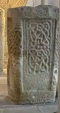 This translates as 'The stone of Baptism' as it was wrongly thought to be a font. What was thought to be a central bowl is now identified as a pedestal with socket to hold a now absent cross. It has interlace pattern and moulded edging