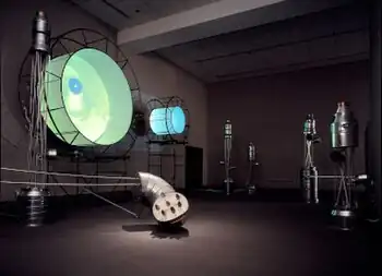 The project served as a model for future River Fugues, which melded video interviews with inhabitants, imagery of each locale, and collected data and observations that Cogswell turned into darkened, "stage set"-like environments employing giant pipes and wheels, water towers and mechanical fixtures softened by the glow of video.[14][2] These subsequent projects examined the lives of other rivers and their relation to society’s collective longing for prosperity, which has often involved harnessing river power for commerce and uncomfortably linking idyllic landscapes with urban industry and technology.[43][8][13] These initial works included Hudson Weather Fugues (Wave Hill, 2005),[18][44] Buffalo River Fugues (Hallwalls, 2006),[43] and Mississippi River Fugues (Art Museum of the University of Memphis, 2008).[8]