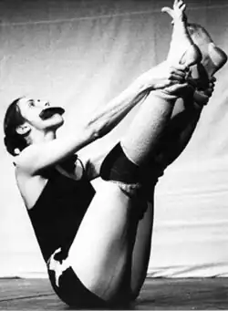 Fisher's performing style has been characterized as striking in presence, virtuosity and concentration, and difficult to categorize.[37][38][7][30] Her unconventional approach—which she labels "cellular movement"—developed out of studies of yoga and contact improvisation; it is based on the body's energy impulses and movement from the joints, rather than patterns in space or movement across a stage.[5][7][3][12] In addition to yoga, her inspirations include American, Italian and Japanese sign language, martial arts, and Bharatanatyam dance.[1][26][31] Critics note as unique to her choreography: chiseled, repetitive gestural isolations that create tension and a sense of pent-up energy;[37][39][9] a focus on smaller body parts (hands, fingers, toes, face, neck) rather than the torso for kinetic expression;[37][7] rhythmic patterns akin to language, poetry or jazz;[40][41][42] and movement on a horizontal, pictorial-like plane.[31][43]