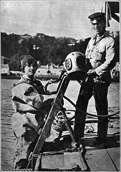 Naylor was fascinated by the work of the divers and asked Foss for the opportunity to dive herself. Initially her proposal was rebuffed but after Naylor studied the subject and questioned the male divers, Foss relented and with no prior experience allowed Naylor to dive on the wreck, 70 feet (21.3 m) down. The first dive almost ended in disaster as Naylor's suit telephone stopped working and the surface team started to haul her up. On reaching the ladder, the surface team continued to haul but one of Naylor's boots had jammed in the ladder. This had the effect of starting to pull the helmet off. Naylor did manage to jerk the safety rope to stop the team and then managed to free her boot before continuing her ascent.[4] Naylor was not discouraged and despite continued opposition dived more and more. Her exploits as the first woman deep-sea diver were reported in the American magazine Popular Science Monthly in August 1920.[5] Her career became more publicly known in the United Kingdom in 1922 following an article in The Daily News which was syndicated across North America and Australia.[6][7][8]