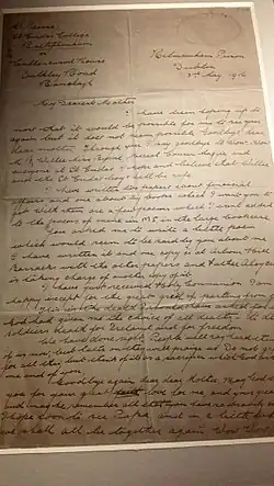 Patrick Pearse founded St. Enda's in 1908 and was the headmaster up until the time of his execution.[16] After Patrick's death, the responsibility for running the school fell to Margaret Pearse and her two daughters, Mary Margaret Pearse and Mary Brigid Pearse.[16] As Patrick Pearse had died without a will, the school was left in a precarious financial position.[16] In May 1924, when Margaret Pearse was aged 70, she undertook a trip to America to raise funds for the school,[23] alongside showing support for Éamon de Valera and the Irish Republic.[24] At an event in Brooklyn on 19 May 1924, when referencing the execution of her two sons, Margaret declared herself the "proudest mother in Ireland".[25] She also stated that Michael Collins had attempted to "bribe" her with an offer to subsidise the school, which she refused.[25] During a meeting in Seattle on 11 August 1924, she again discussed her sons and how she believed "the best way to honour their memory was to carry on their work for Ireland".[24] Margaret raised over $10,000 in donations for the school during the trip.[24] Notwithstanding Margaret's fundraising activities, St. Enda's continued to decline and eventually closed in 1935.[16] Great Brunswick Street, where Margaret and the Pearse family originally lived, was renamed Pearse Street in 1920 by a resolution passed at the Dublin City Council meeting.[26]